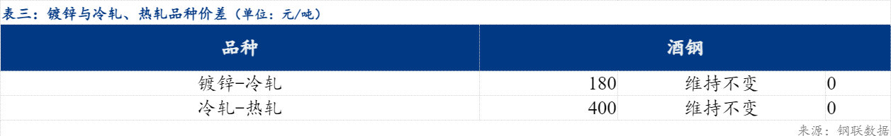 价差方面看,今日兰州与西安市场价差维持不变、与安阳市场价差正向缩小20元/吨、与天津市场价差正向缩小10元/吨、与乌鲁木齐市场价差维持不变。品种价差看,今日镀冷价差维持不变,冷热价差维持不变。