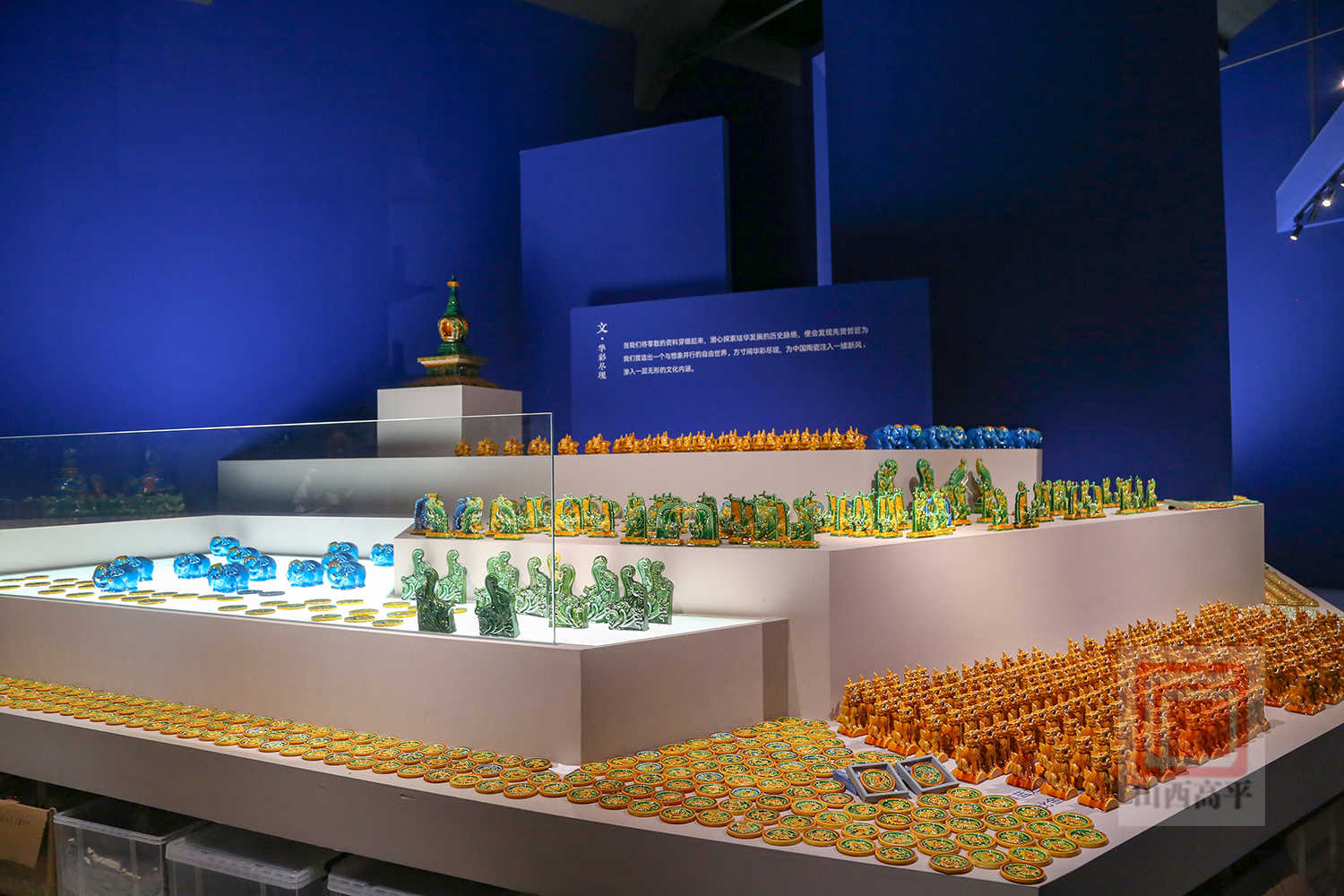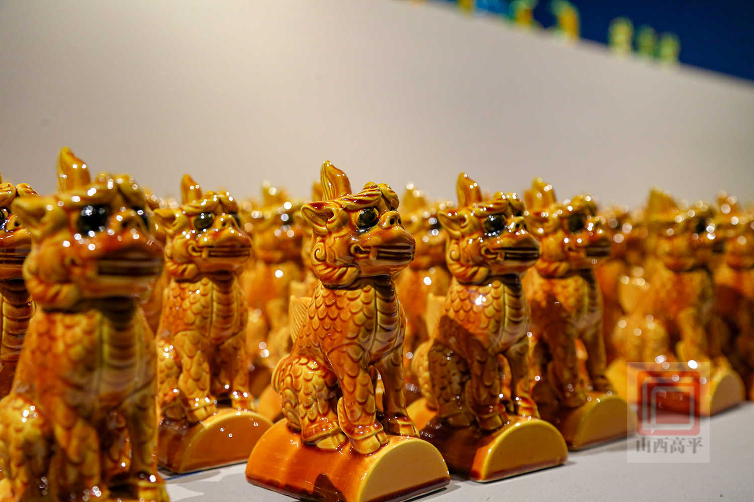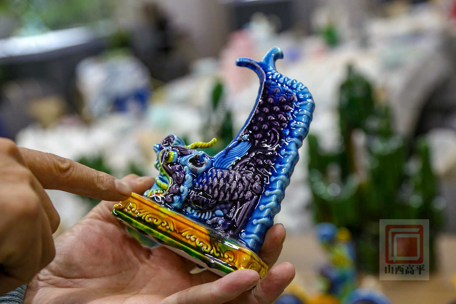 “琉璃之美,首在釉色。高平琉璃胎质细密坚固,釉色考究纯粹,选用山上的矿石质料和优质坩土,参加氧化铜、氧化钴等不同的着色剂,出现出蓝、绿、黄等纯洁丰满的颜色。”解兴明指着一件孔雀蓝琉璃著作介绍道:“孔雀蓝一色非常美丽,但因烧成区间短、配釉难度大,烧制要求更为苛刻。”